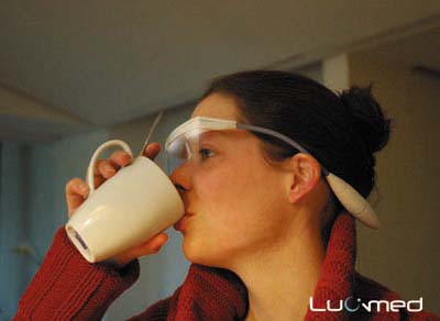 Belgiasta. Käytetään valohoitoon silmälasien tavoin. Luminette